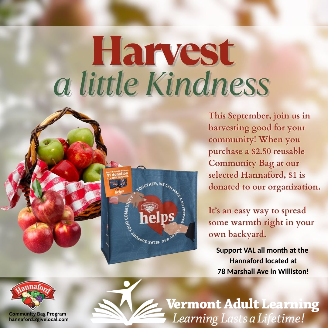 Attention Williston shoppers! Did you know that if you purchase a Community Bag at the Hannaford located at 78 Marshall Ave during the month of September, $1 will be donated to VAL? It’s a great way to support our learners *and* the environment!
